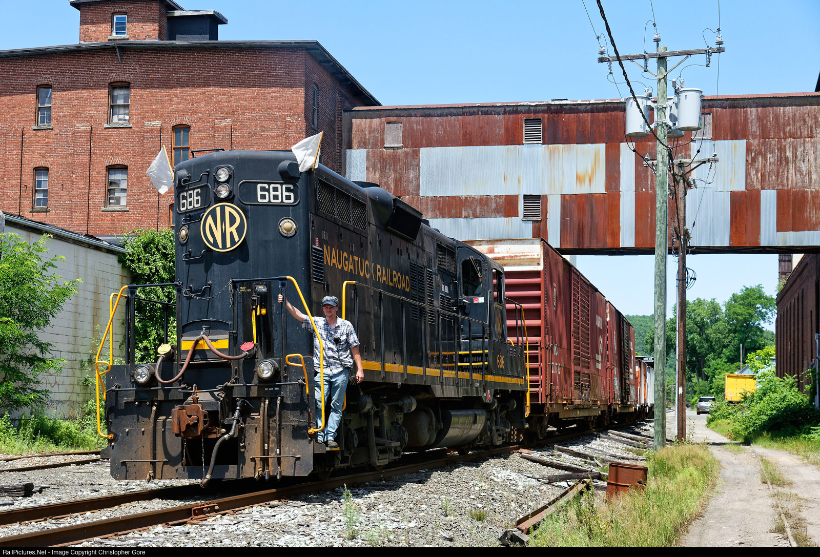 | Naugatuck Railroad GP9 686 has just picked up two former Conrail boxcars in Waterbury. This was a special photo freight train that was part of the Railroad Museum of New England's Railfan Day With FL-9 2019. |