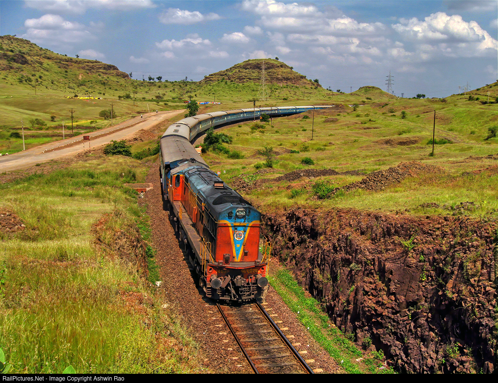 | 16381 Mumbai Kanniyakumari Express hauled by Gooty Shed's WDM3a #14031 curves into Daundaj. Many trains were diverted on this route due to floods at Raichur district on Pune Solapur Guntakal line at that point of time. Presenly this section is completely doubled and electrified. These alcos are also decommisioned now. |