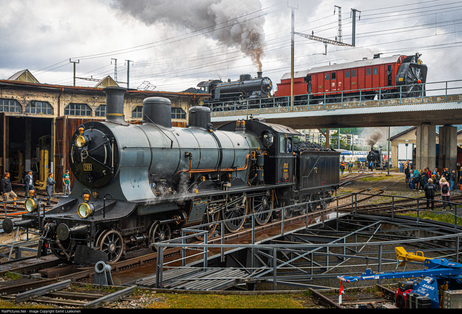 Class A 3/5 steam locomotive number 705 has come from shead on the turntable. As the locomotived has been turned, the class C 5/6 2978 steam locomotive puffs with type Xrot snow plough.