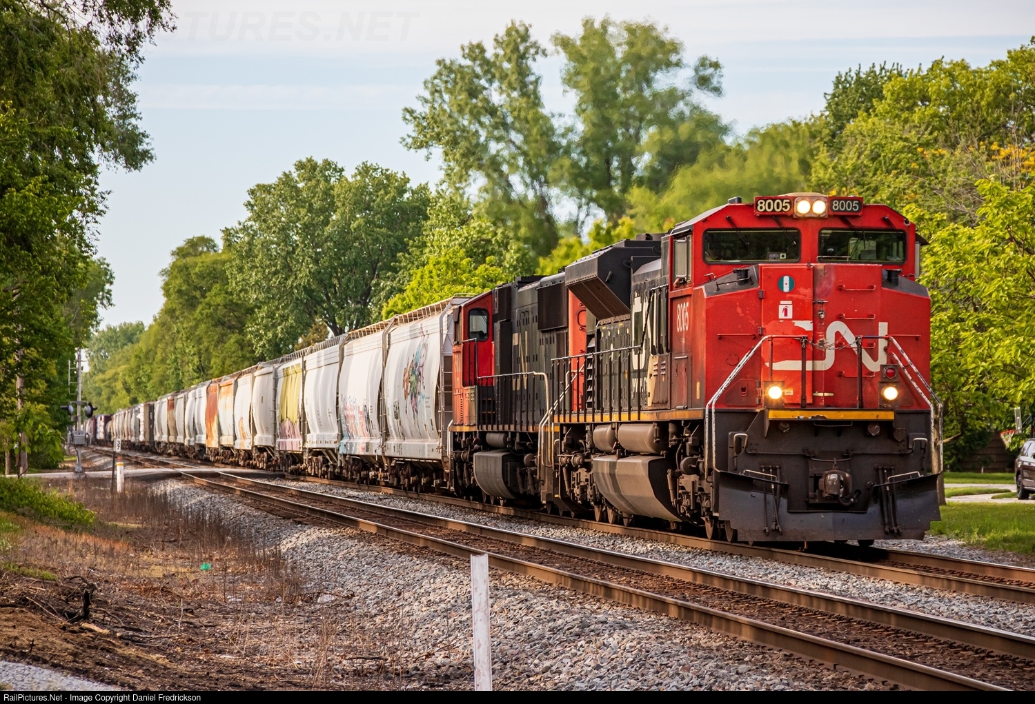 | CN 8005, one of the few active CN SD70M-2s sporting a "Thundercab", leads a westbound freight through Griffith, IN. |