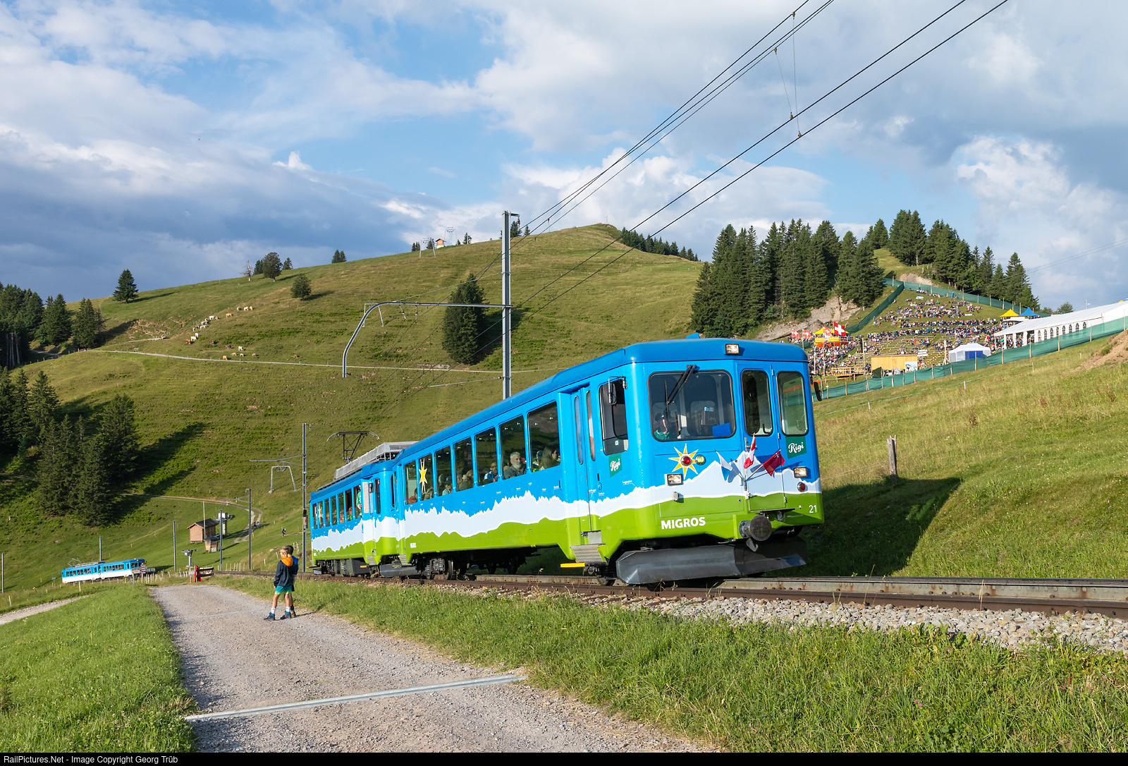 | On the occasion of the Rigi Schwingen (Swiss wrestling and alpine festival) on Rigi Staffel, trains ran every 20 minutes from 6:35 a.m. on the Rigi Bahnen line from Arth Goldau to Rigi Staffel. Train 411 with control car Bt # 21 and railcar BDhe 2/4 # 11 (built 1949, in Migros Luzern paint scheme) is below Rigi Staffel on the ascent at 7:50 a.m. Railcar # 14 with cab car # 24 can be seen following on sight distance in the background. In the background, the festival grounds of the Rigi Schwingen. |