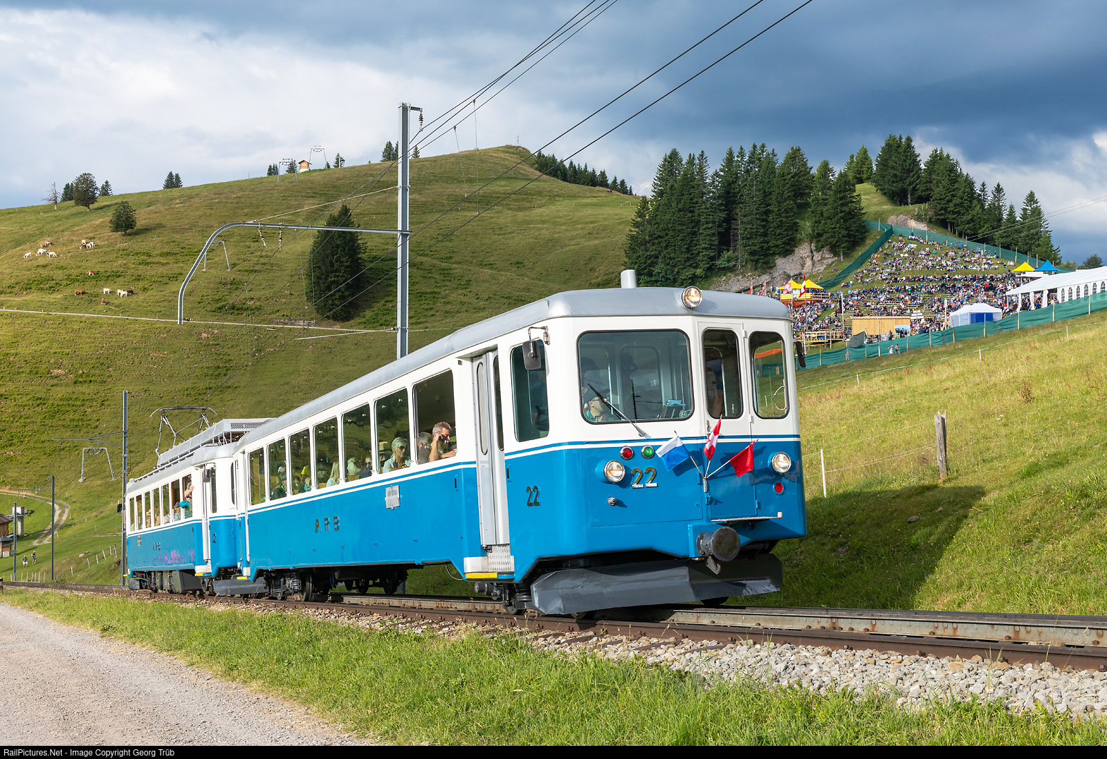 | On the occasion of the Rigi Schwingen (Swiss wrestling and alpine festival) on Rigi Staffel, trains ran every 20 minutes from 6:35 a.m. on the Rigi Bahnen line from Arth Goldau to Rigi Staffel. Train 413 with control car Bt # 22 and railcar BDhe 2/4 # 12, brough back in the old blue/white paint scheme in 2022, is below Rigi Staffel on the ascent at 8.10 am.The Rigi Schwingen festival grounds can be seen in the background. |