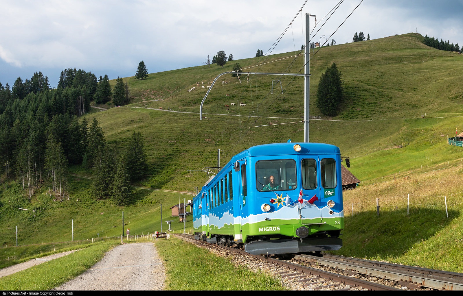 | On the occasion of the Rigi Schwingen (Swiss wrestling and alpine festival) on Rigi Staffel, trains ran every 20 minutes from 6:35 a.m. on the Rigi Bahnen line from Arth Goldau to Rigi Staffel. Second train 413 with control car Bt # 23 and railcar BDhe 2/4 # 13, in the Migros Luzern publicity paint scheme, is below Rigi Staffel on the ascent at 8.10 am. There are currently two trains on the Rigi with this livery. |