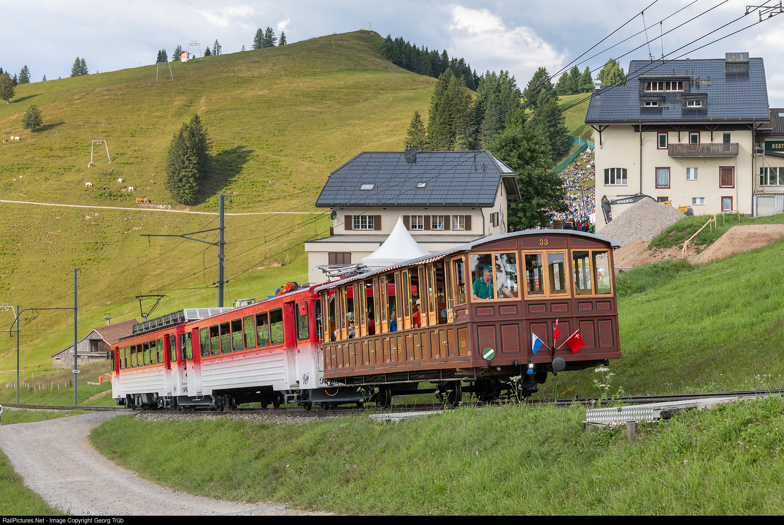 | On the occasion of the Rigi Schwingen (Swiss wrestling and alpine festival) on Rigi Staffel, trains ran every 20 minutes from 6:35 a.m. on the Rigi Bahnen line from Arth Goldau to Rigi Staffel. Train 415 is on the ascent below Rigi Staffel at 08.30 am, with car B # 33 of 1875, when the line of the ARB was opened, cab car Bt # 32 (with pantograph for ice scratch) and cogwheel railcar BDhe 4/4 # 22 "Beeri" built 1986 for the Vitznau-Rigi-Bahn. |