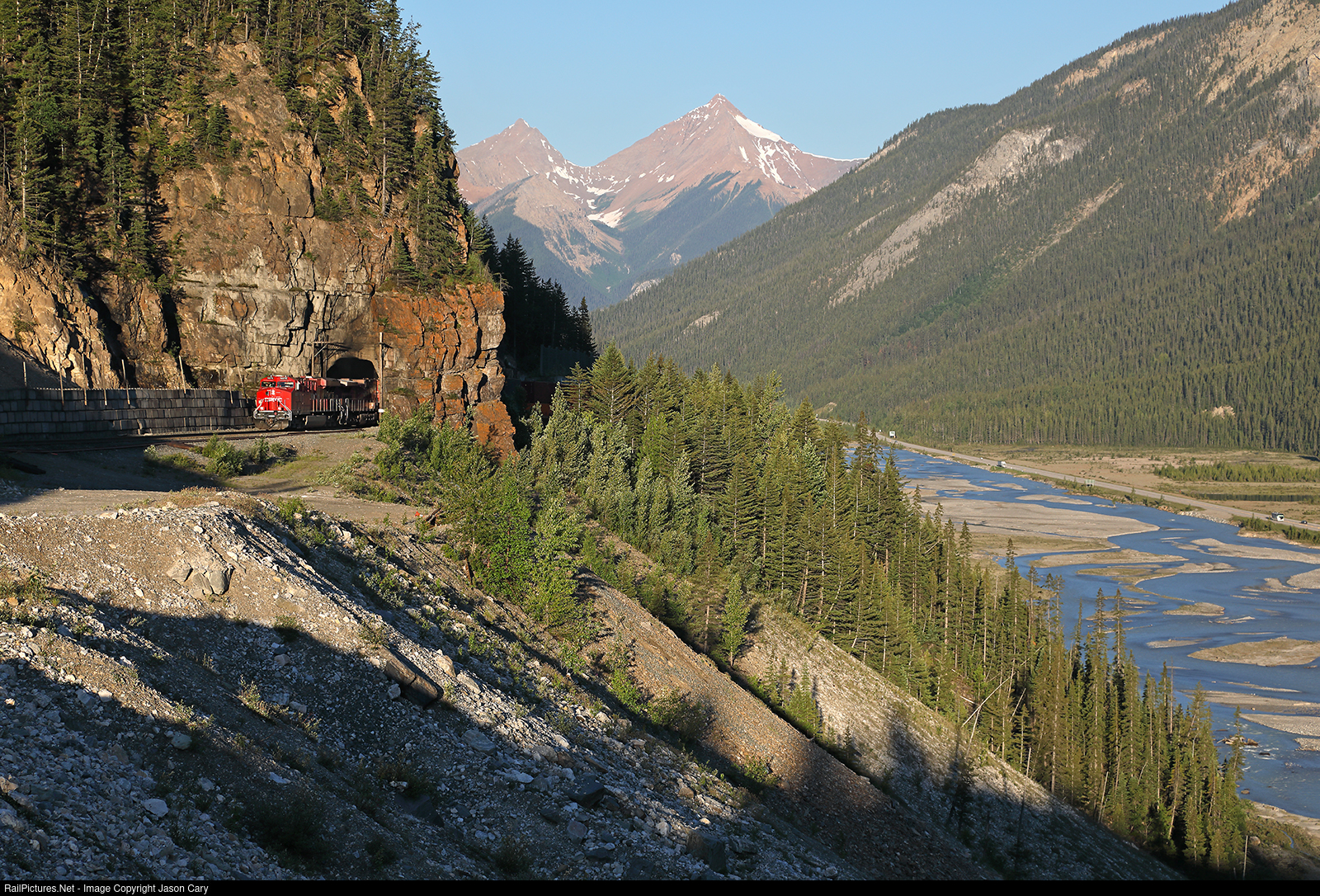 The Big Hill 2.4% A shiny new CPKC locomotive leads an eastbound stack train up the 2.4% section of Canadian Pacific's original "Big Hill" at first light. The original line reached a staggering 5.2% near the bridge across Kicking Horse River. The bridge still remains to this day, with the highway using much of the Railroad Right of Way. In about a 1/4 mile the train will diverge from the original alignment to the new Spiral Tunnel alignment. The reason Kicking Horse Pass was chosen in the first place was more political than operational. 30 miles north of Kicking Horse was Howse Pass which would likely had a ruling grade of 1 to 1.2%, but this was thought by politicians to be too far north. Luckily for railfans the route chosen was the most spectacular route one could choose, other than perhaps the originally planned route of 2.2% along the face of Mt Stephen. The Stephen route would have had the tracks several hundred feet higher than where I am standing in the picture. The highway at the the bottom right, partly uses and parallels a branch line from Field to a large mill that serviced the aerial tram network for the Zinc and Silver mines in along the valley. Dave Gayer shot a spectacular spread from here in the Nov 1994 issue of Pacific Rail News... that article is a great inspiration...
