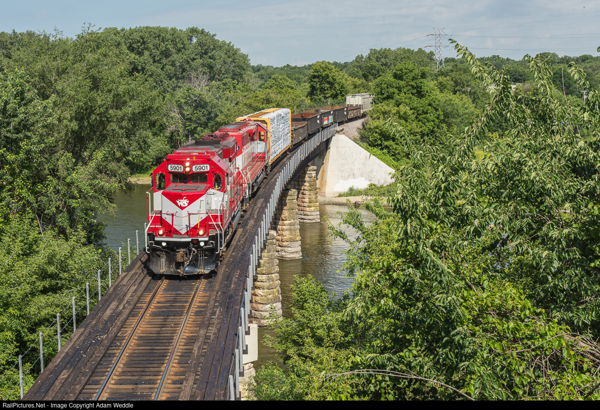 | WAMX 5901 leads Y302 East on the WSOR Fox Lake Sub. The train has just left the Janesville Yard, and is crossing the Rock River. |