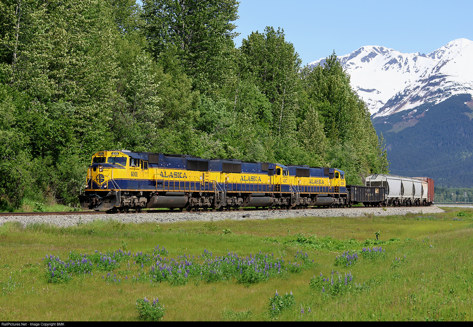 ARR 4001 leads a Whittier to Anchorage freight train through the Turnagain Arm just north of Girdwood past the many Lupine flowers that line the Seward Highway..