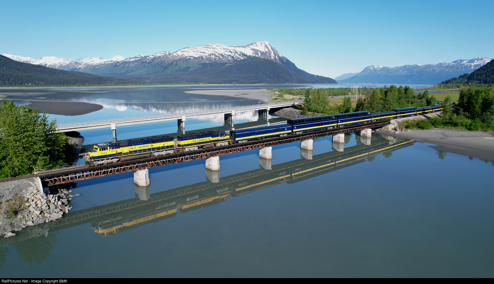 Its a picture perfect morning as the Coastal Classic rolls over the Twenty Mile River bridge in Portage on its way to Seward Alaska. What a nice view from the air!