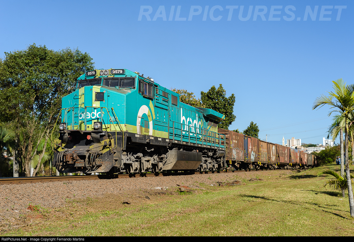 | GE Dash 9-40BBW No. 9579 from Brado Logística heads south as DPU on the loaded train through Jandaia do Sul, PR, on the afternoon of July 5, 2025. |