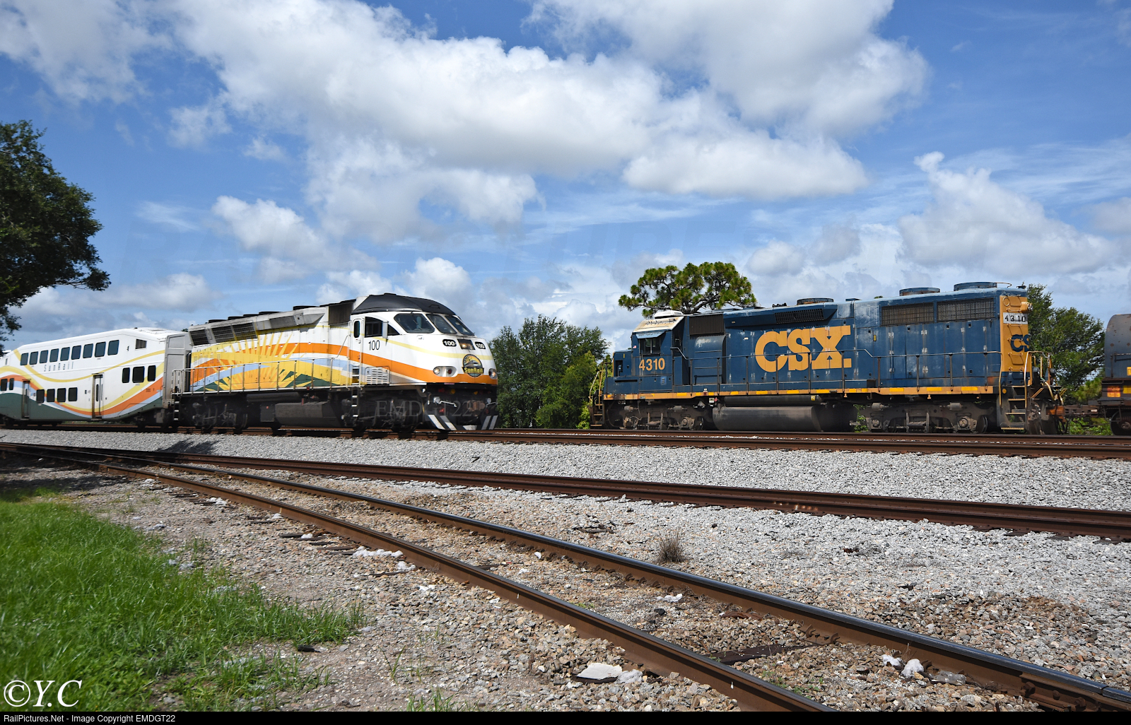 A northbound Sunrail passes CSX L722 as it heads into Sand Lake Road station.