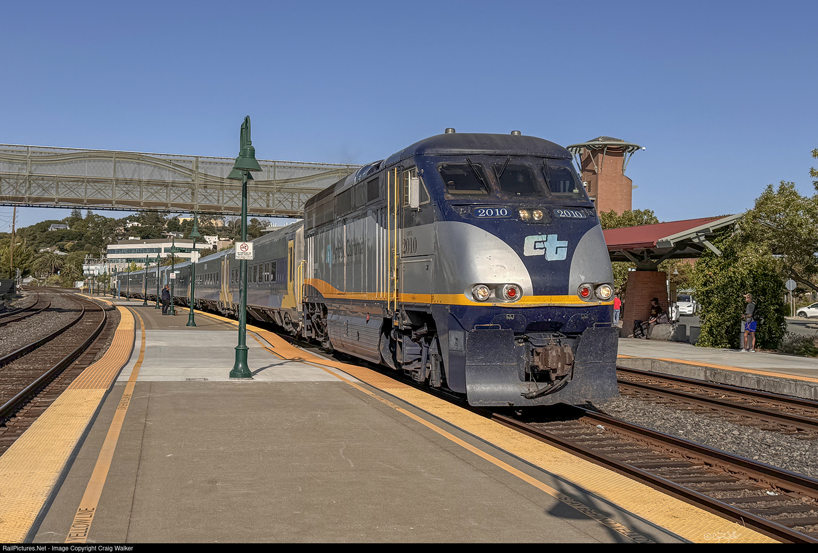 Rolling into the Martinez station is Amtrak train 715, a westbound Bakersfield to Oakland-Jack London San Joaquin. CDTX 2010, a California Department of Transportation owned, Alstom-built F59PHI leads this train, consisting of six Siemens-built "Venture" cars, with CDTX Non-Powered Control Unit 90278 (formerly Amtrak F40PH 278) on the rear. This train arrived 25 minutes late. The two tracks closest to the station are Union Pacific's Tracy Sub, heading down the San Joaquin Valley, while the two mainlines farthest from the station are UP's Martinez Sub heading east to Roseville, just beyond Sacramento. (Martinez, California – June 23, 2025)