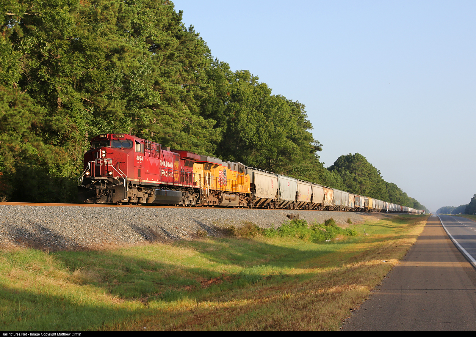 CP 8074 leads a fast moving grain load along Hwy 71, south of Ashdown, AR.