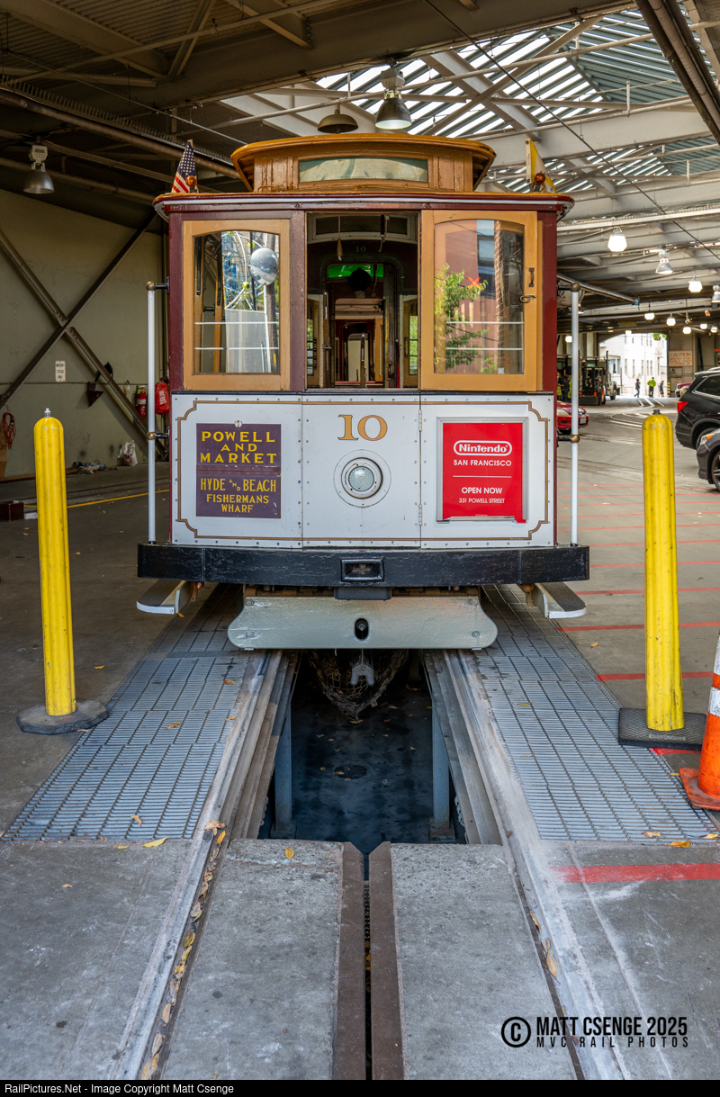San Francisco Municipal Railway (Muni) cable car 10 is seen at rest just inside the car barn on Washington St. The inspection pit here allows a unique view of the car: one where the grip - which is typically below the street surface - is visible dangling below the car. The pits here not only allow for under car inspections as they do on other railroads, but also provide a location where the grip assembly can be removed from the car - a regular occurrence as wear from operation requires grip dies be replaced every three to four days! Car 10 was built by Carter Bros. in 1893, and sports the standard Powell St maroon livery. |