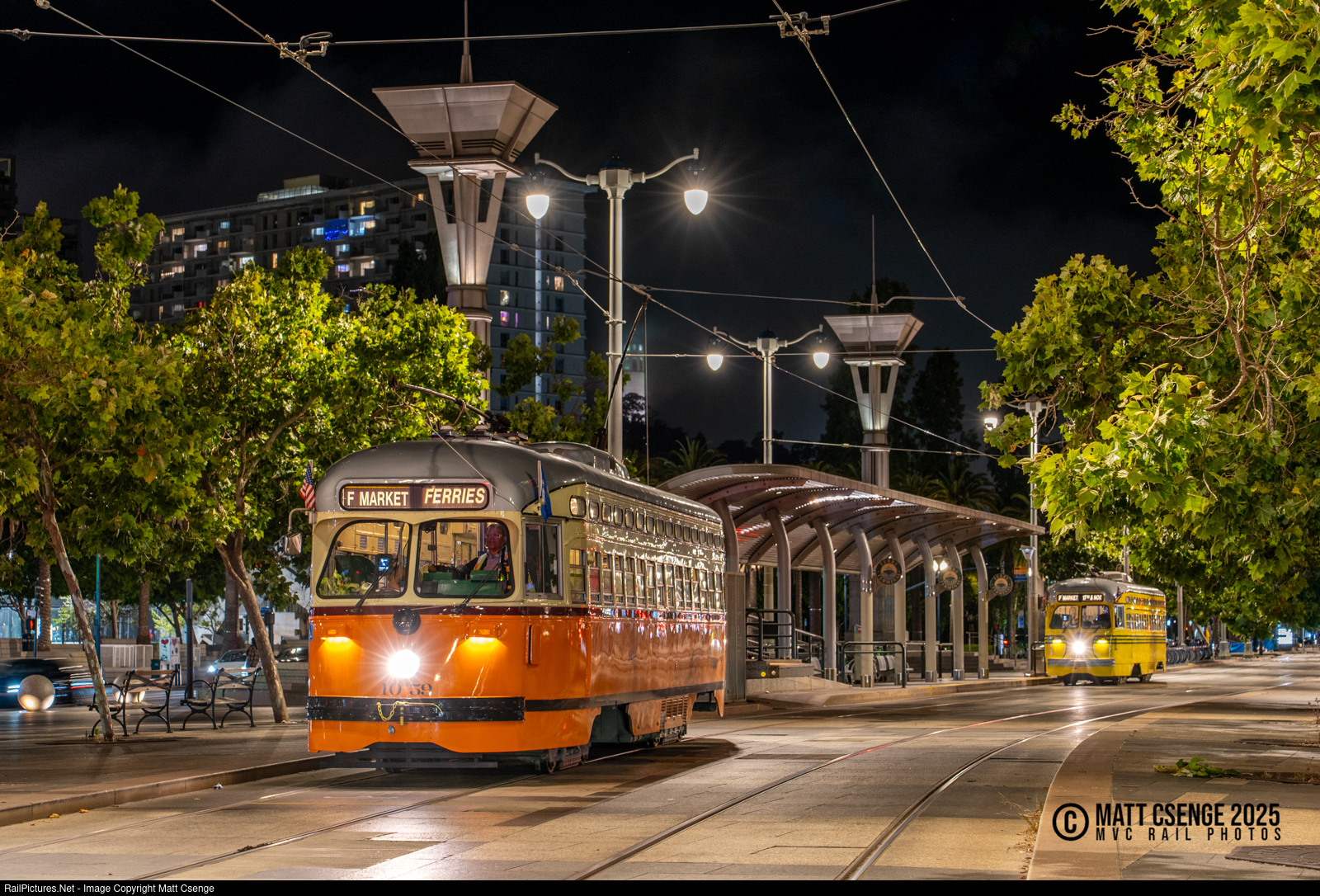 Late Night Light Rail. Two San Francisco Municipal Railway (MUNI) PCC cars are seen staged on the Embarcadero at Don Chee Way waiting for their turns to curve onto the Market Street section of the F Market and Wharves line. In the foreground is car no. 1059, painted in Boston Elevated Railway colors. In the background in car 1057, painted in Cincinnati Street Railway scheme. Both cars were originally built for Philadelphia Transportation Co. (PTC) in 1948, and have been rebuilt twice to date.