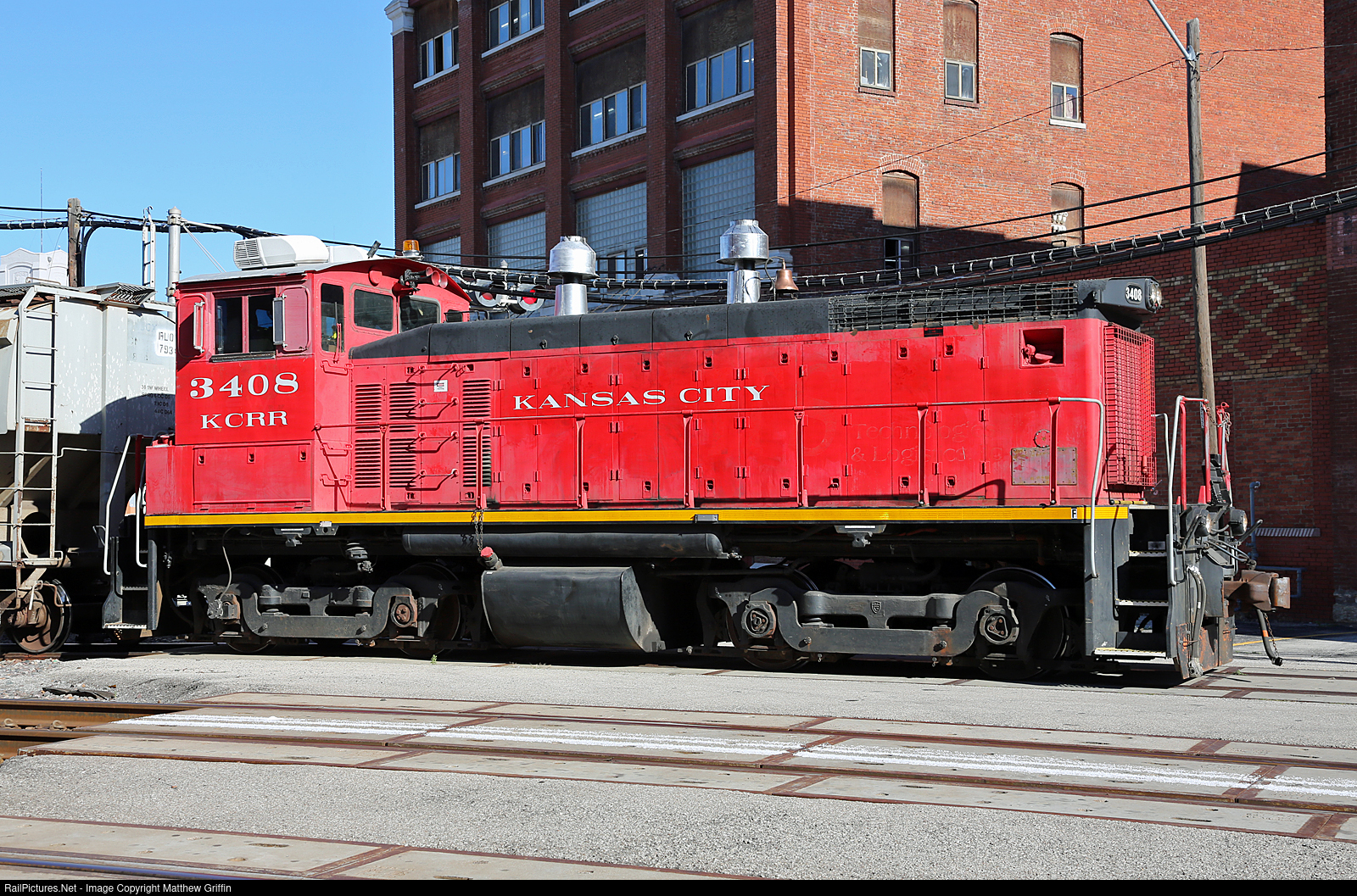 KCRR 3408 goes about switching duties in the Bottoms area of Kansas City.