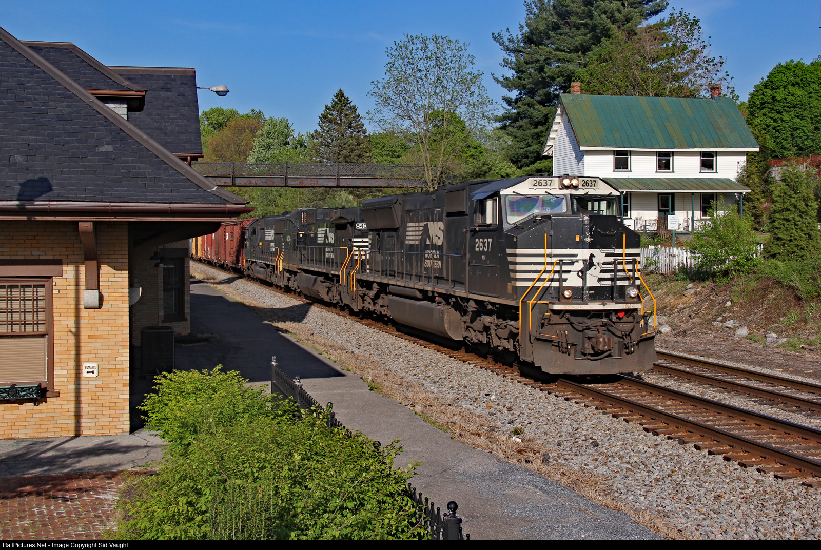| Sailing by the passenger station this WB mixed freight looks great from the platform of the preserved caboose on display. The old road foreman's house dates from prior to the Civil War and is being restored at present and the station is undergoing a new refurbishment. |
