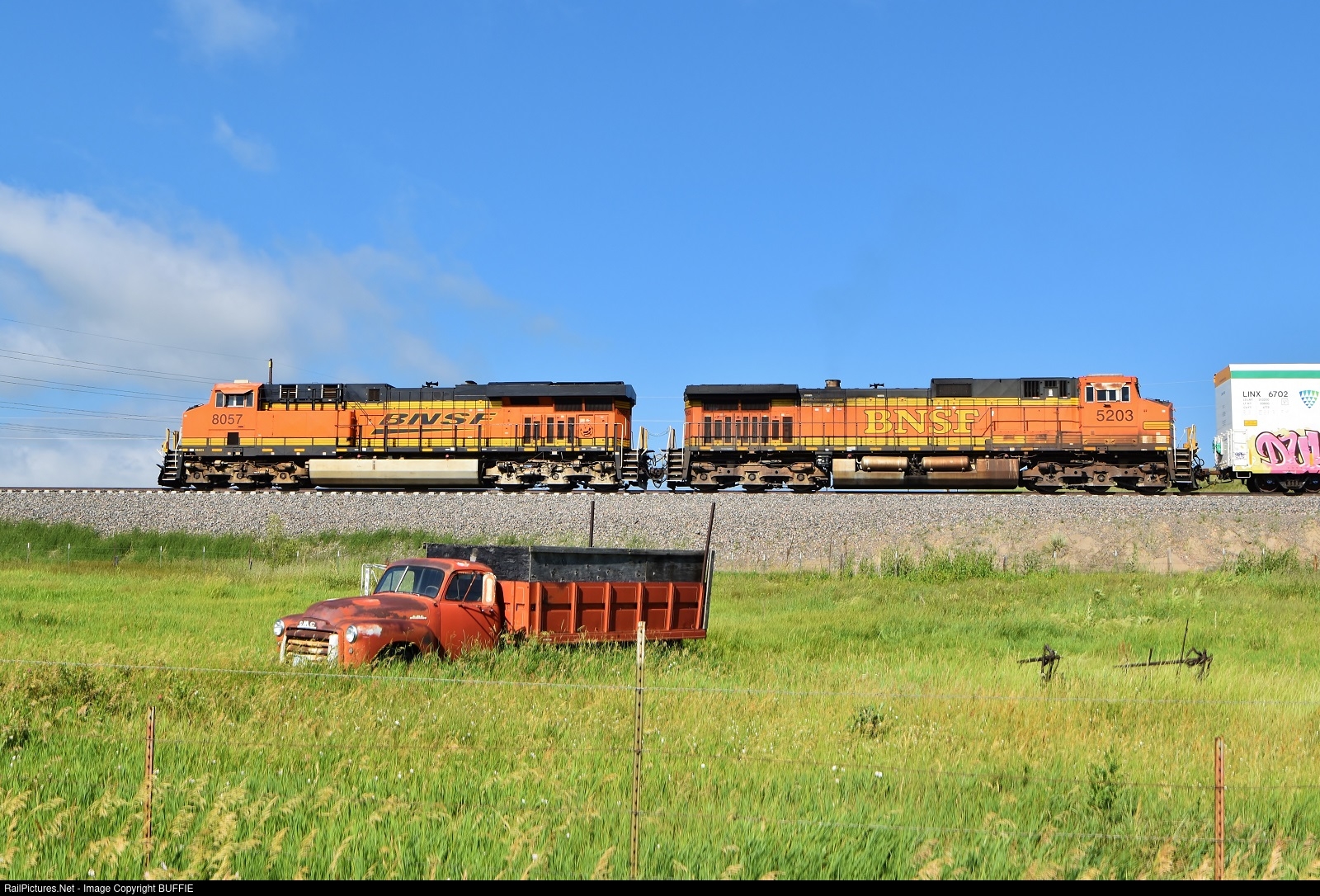 BNSF 8057 (ES44C4) leads a manifest train past an old farm truck in Greenland, Colorado.