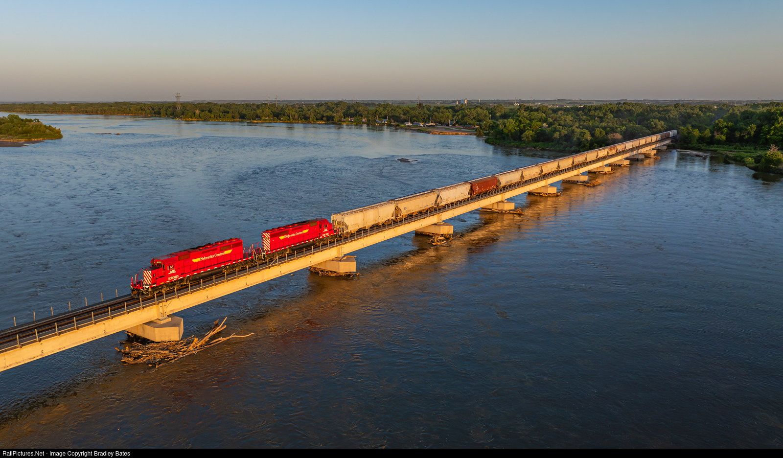 | Running on BNSF trackage rights up the Bellwood Sub, NCRC SD40-2's #8123 & #8132 lead the ADM Turn into Columbus, NE. as they cross the Platte River in beautiful golden sunlight. |