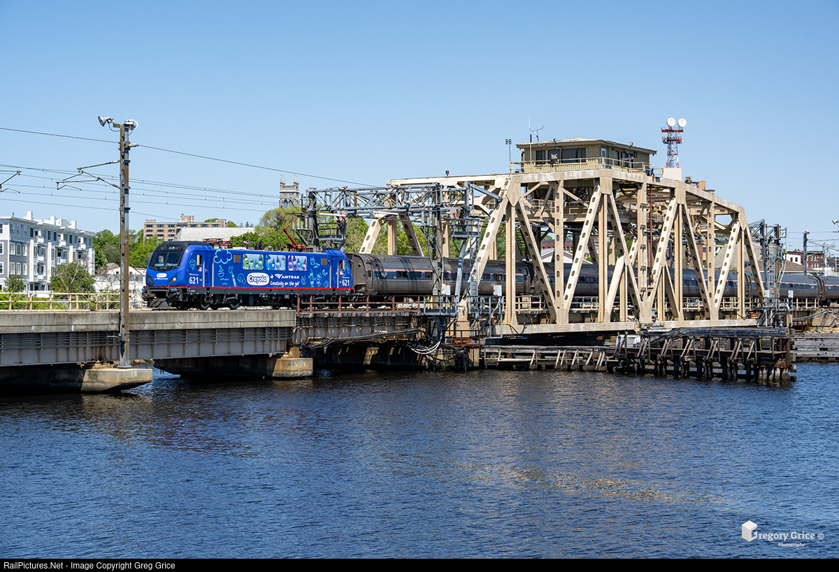 On May 12th, 2025, Amtrak's Crayola-wrapped ACS-64 #621 leads Regional Train 85 east over the Shaws Cove Bridge in New London, Connecticut on the Shore Line section of Amtrak's Northeast Corridor. 621 is one of two locomotives wrapped in special Crayola schemes as part of a partnership to promote family travel and creative exploration. This unit features the color Violet Blue, and eight fan-favorite crayons that were brought back from retirement.
