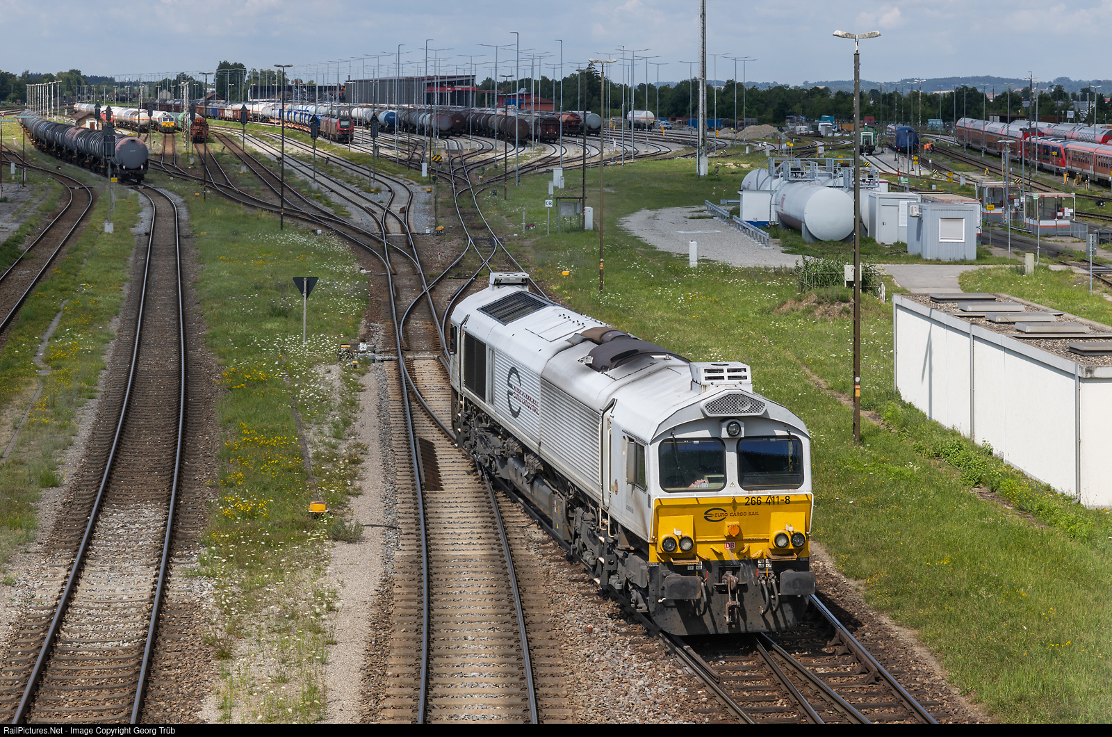 | Diesellocomotive 266 # 411 of the Euro Cargo Rail (daughter of Deutsche Bahn, now DB Cargo France) in Mühldorf (Oberbay). |