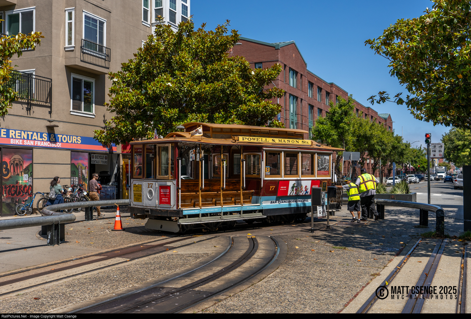 San Francisco Municipal Railway (Muni) cable car 17 is seen taking a spin on the turntable at Bay St / Taylor St in preparation for its Powell-Mason line trip to Powell St / Market St. Car 17 was built by Mahoney Bros. in 1887, and notably features the "Bombay" style roof with higher clerestory and "eyebrow" windows on the ends. |