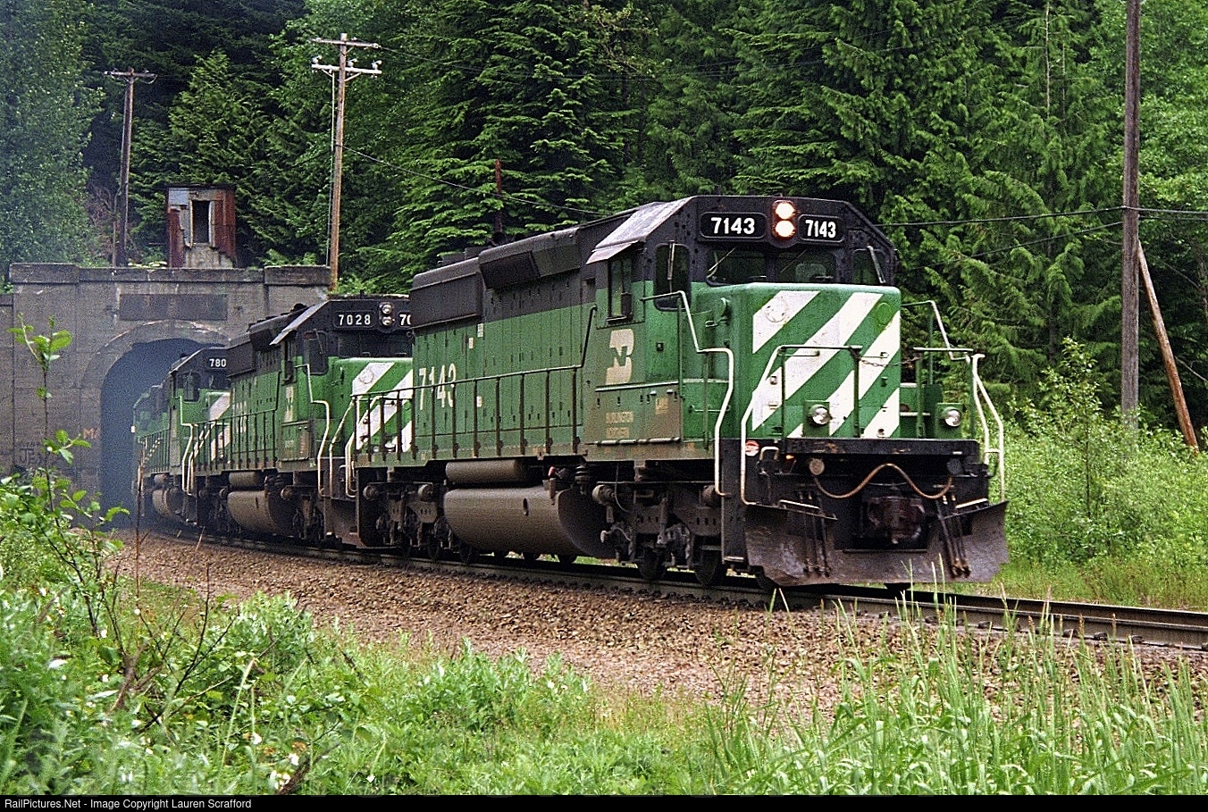 Burlington Northern, BN 7143 leads a W/B Intermodal out of the Cascade Tunnel at Scenic, WA on August 10, 1994 with BN 7028, 7800 and a fourth unidentified SD40-2. The Cascade tunnel is tunnel #15 on the Scenic Subdivision and 41,152 feet in length.