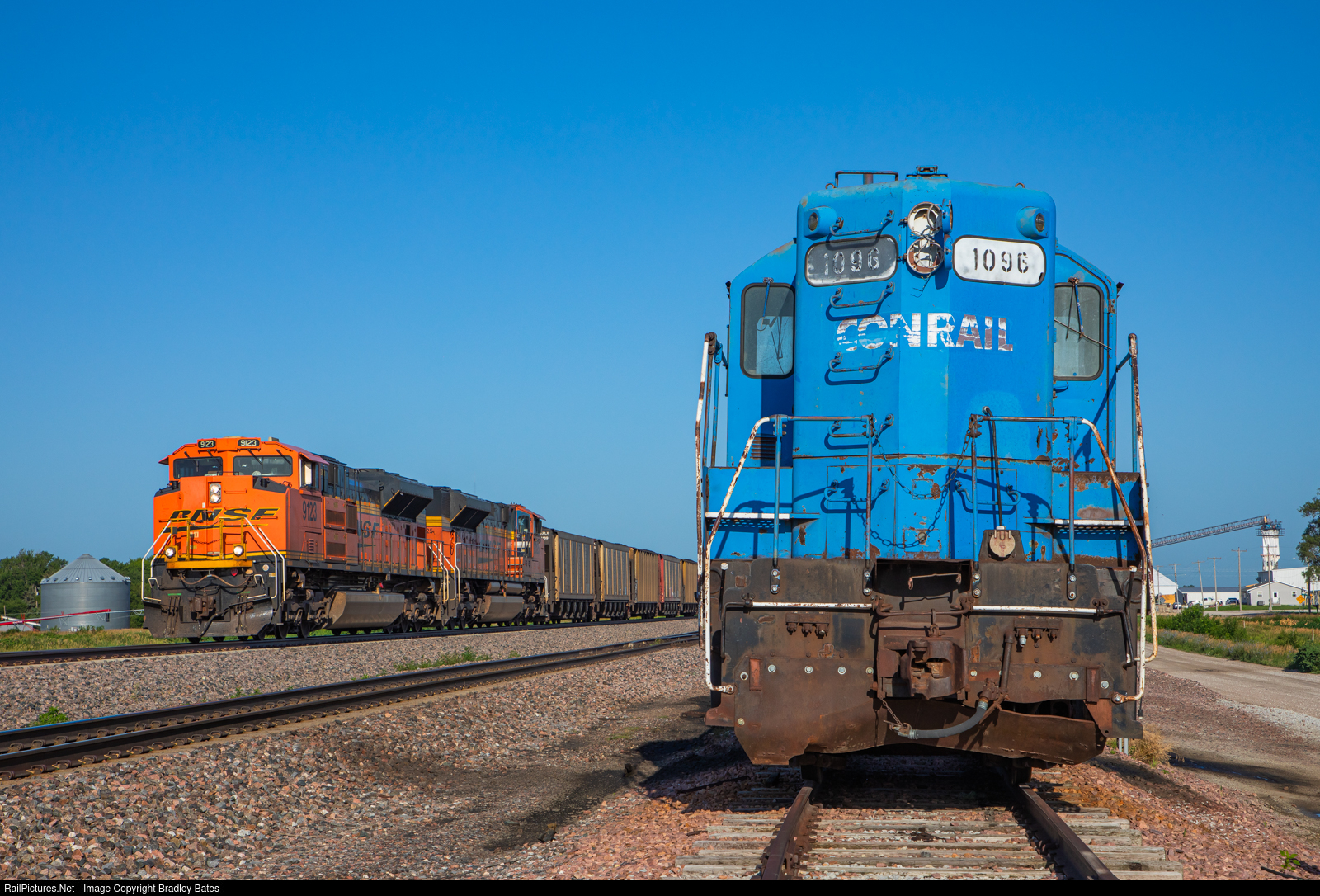 | A BNSF Coal Train races eastbound passing by FCA GP8 #1096 still wearing its Conrail paint and IBCX SD18 #7309 in Tamora, NE. |