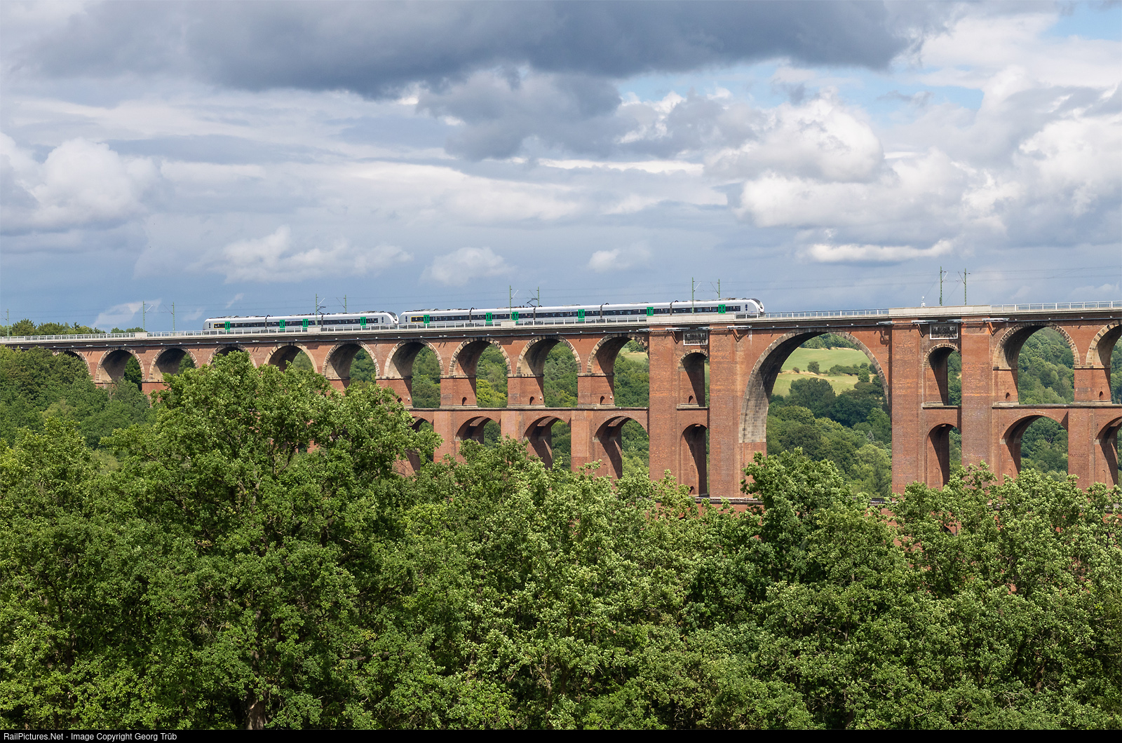 | Alstom Coradia Continental 1440 of the Mitteldeutsche Regiobahn (MRB) are crossing the huge Göltzschtal viaduct near Netzschkau, running as train 74025 of the line RE3 from Hof to Dresden. Mitteldeutsche Regiobahn (MRB) is a brand of the railway companies Transdev Regio Ost (TDRO) and Bayerische Oberlandbahn (BOB), both of which belong to the French Transdev Group. They have 13 of the 3-car and 16 of the 5-car version of the Coradia Continental for the Hof-Dresden services. The doubletrack Göltzschtal viaduct on the Sachsen mainline between Hof and Leipzig/Dresden was built from 1846 to 1851 and is the world's largest brick-built viaduct, with a length of 574 meter and a maximum height of 78 meter. More then 26 mio of bricks were needed for the 4 levels, and the uppermost level has 29 arches. |