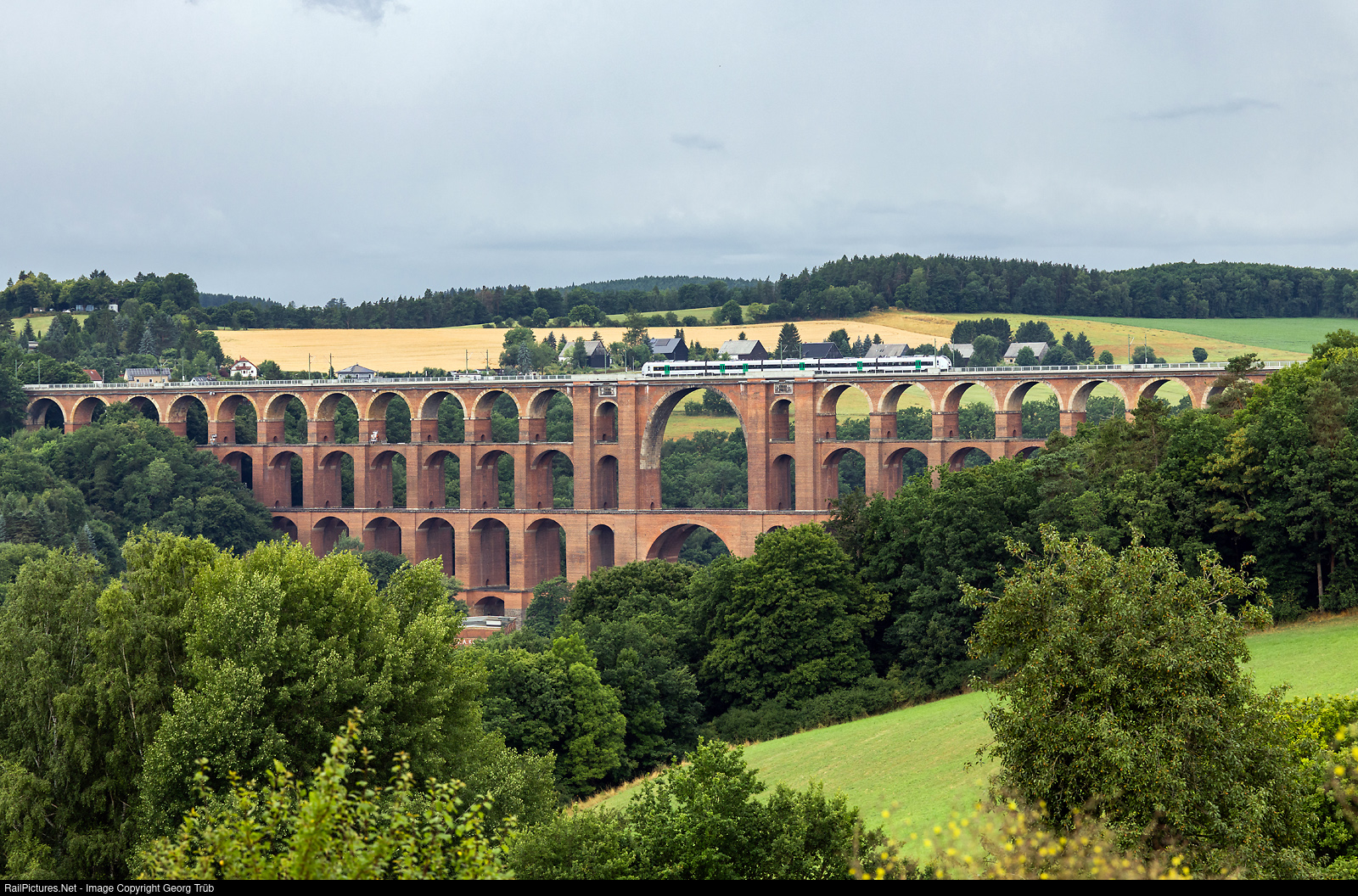 | An Alstom Coradia Continental 1440 of the Mitteldeutsche Regiobahn (MRB) is crossing the huge Göltzschtal viaduct near Netzschkau, running as train 74008 of the line RE3 from Dresden to Hof. Mitteldeutsche Regiobahn (MRB) is a brand of the railway companies Transdev Regio Ost (TDRO) and Bayerische Oberlandbahn (BOB), both of which belong to the French Transdev Group. They have 13 of the 3-car and 16 of the 5-car version of the Coradia Continental for the Hof-Dresden services. The doubletrack Göltzschtal viaduct on the Sachsen mainline between Hof and Leipzig/Dresden was built from 1846 to 1851 and is the world's largest brick-built viaduct, with a length of 574 meter and a maximum height of 78 meter. More then 26 mio of bricks were needed for the 4 levels, and the uppermost level has 29 arches. |