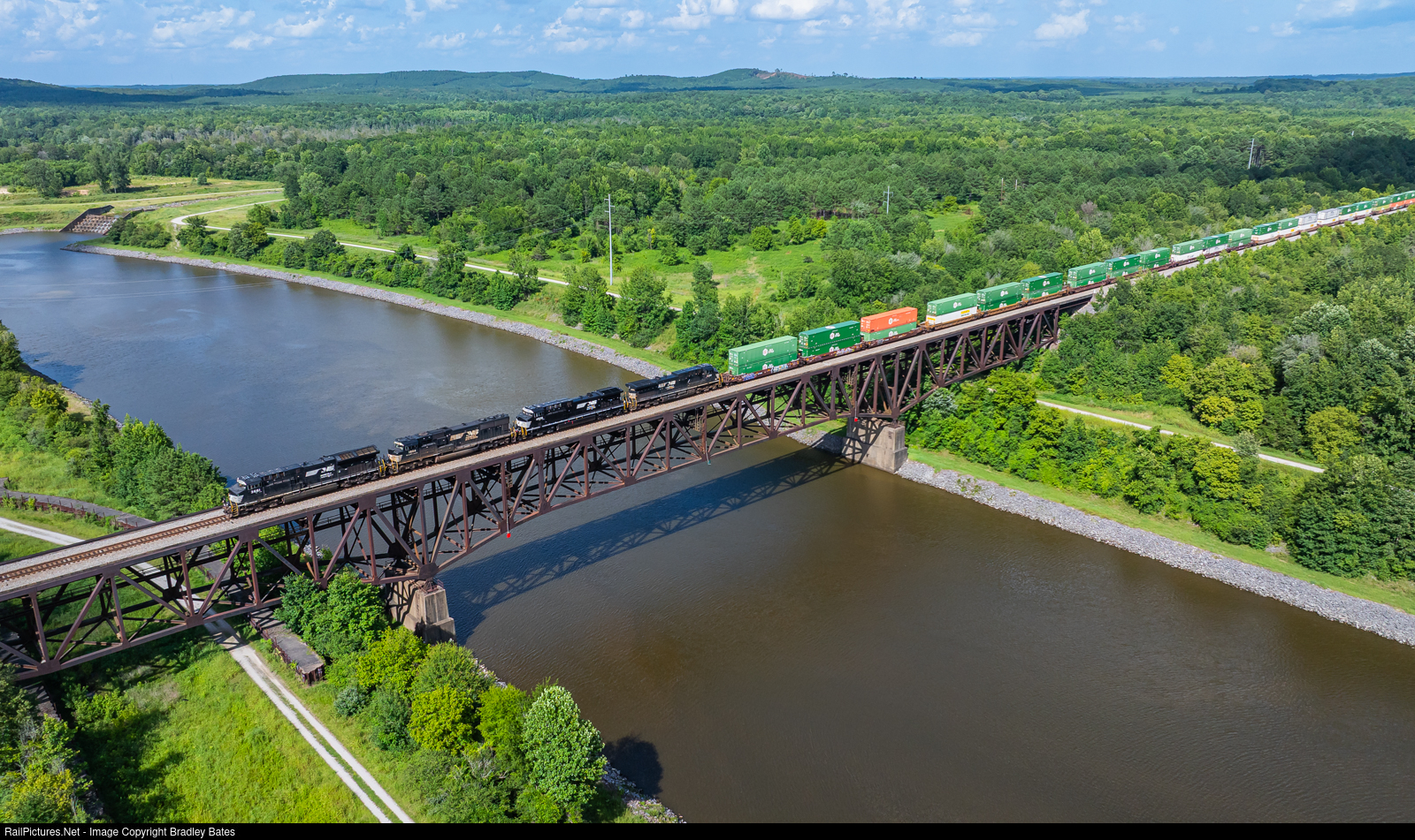 Norfolk Southern Intermodal Train 289 roars westbound across the Tombigbee Waterway in Burnsville, MS. on a beautiful Saturday afternoon.