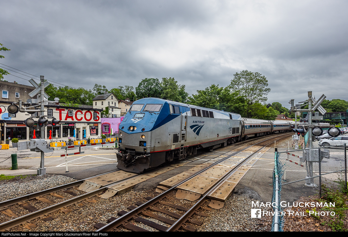 Taco Tuesday. Amtrak Train 233 was passing through Peekskill, New York over Hudson Avenue and the first public railroad crossing from Grand Central Terminal heading north on the afternoon of May 29, 2025. AMTK P42DC 119 is leading, and is the only power on this train as its trailing P32AC-DM had experienced mechanical problems and was left in Croton Harmon. For the past 10 years, "Taco Dive Bar" across the street has been serving up tacos, nachos and tequila. They are closed on Monday, but of course open on Tuesdays.