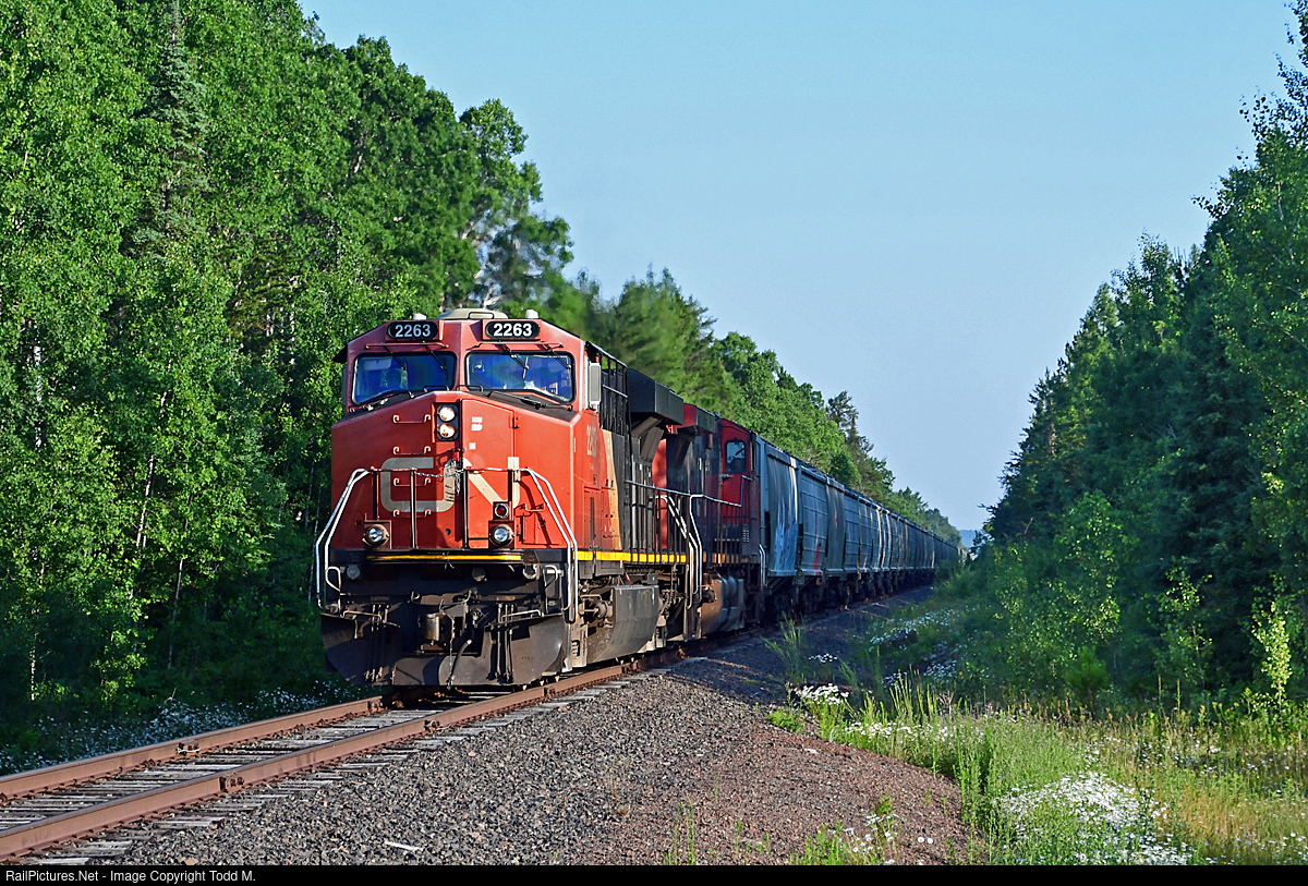 | CN 2263 shoves 102 CN grain cars into storage on the Hinsdale Branch. This branch was used by the DM&IR to access Erie Mining Co. when they were in operation up until final owner LTV Steel went bankrupt in 2001. |