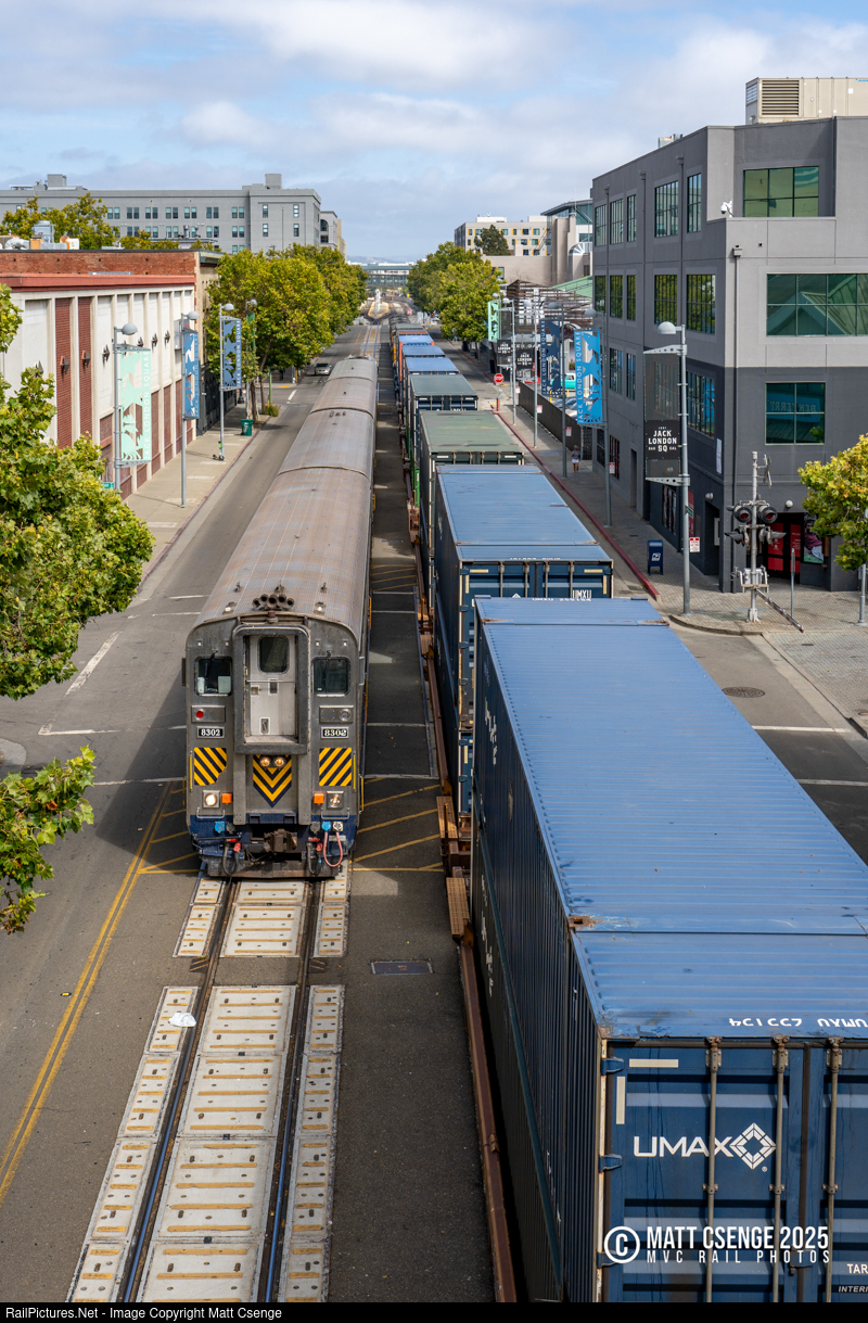 Street Meet. Amtrak California cab car no. 8302 (Morrison-Knudsen/Amerail, 1994-1997) is on the end of Capitol Corridor train 538, seen shoving through Jack London Square on the street trackage on Embarcadero West.