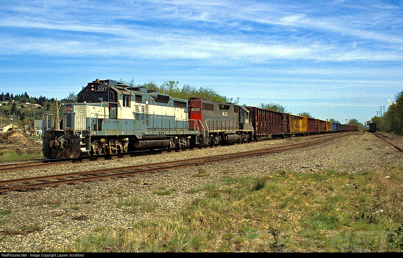 Puget Sound and Pacific, Hoquiam Turn led by TPW 2017 and HLCX 3841 at the former Northern Pacific Yard in Hoquiam, WA on April 2, 2004. The TPW 2017 is a former ATSF GP20u and the HLCX 3841 is a former Southern Pacific GP38-2.