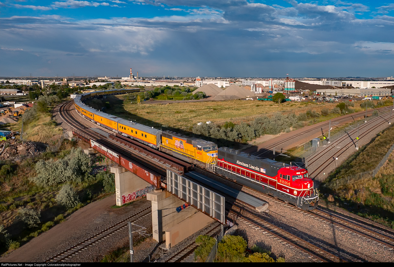 Abraham Lincoln Passenger Special Day 1 Union Pacific 1616 makes it debut with the upsteam program and runs an extra south to Denver the day the replica Denver Post Cheyenne Frontiers Day Train returned to Cheyenne. Seen here at North Yard on the Belt Line coming west on the Moffat Sub for its final tie down at North Yard at Pecos.