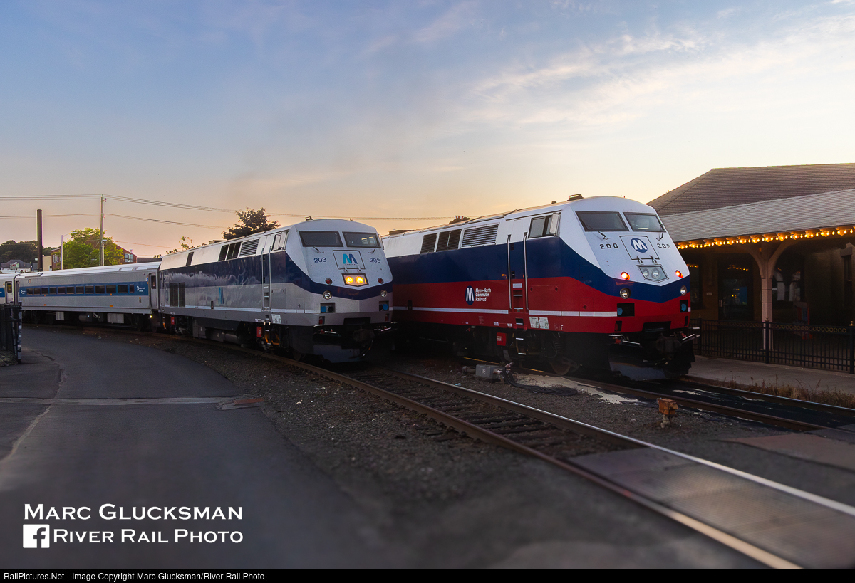| First And Newest Heritage Meet. On the evening of Wednesday, July 23, 2025, all four of the MTA Metro-North Railroad Grand Central Terminal to Danbury trains were led by heritage units. This allows for a number of passing meets just outside of the former Danbury Union Station that is today the Danbury Railway Museum. MNR Train 1848 MNCW 208 ('Beachball'/40th Ann) had arrived earlier and was parked in its usual spot as MNR Train 1860 MNCW 217 (NYS-Penn Central/40th Ann) passed. These paint schemes represent adjoining eras of MTA control of the commuter railroads, and respectively the first and most recent designs in the railroad's Heritage Unit Program.