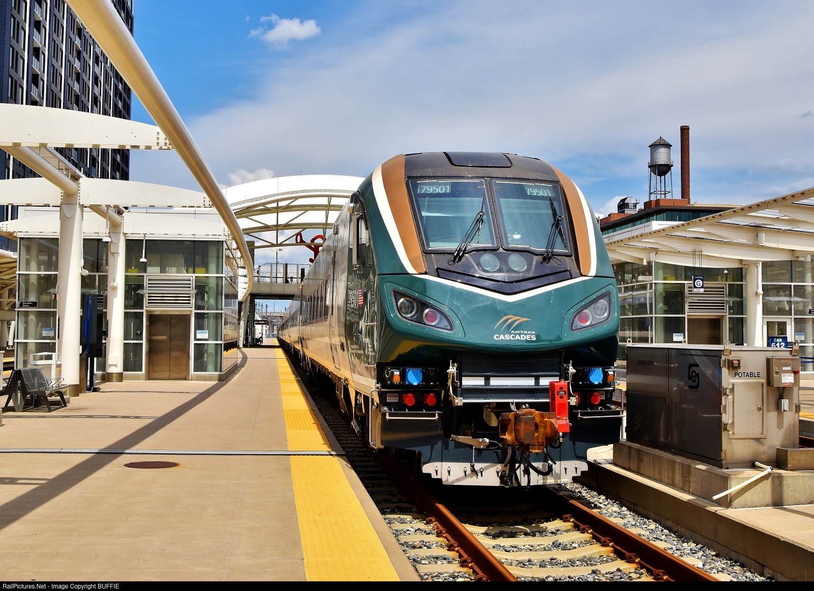 | A sight not likely to be seen again is Amtrak's newest Siemens Airo Cascades train, seen here Parked at Denver's Union Station in downtown Denver. It will soon be taken to the testing facility in Pueblo, Colorado on the famed Joint Line from Denver. |