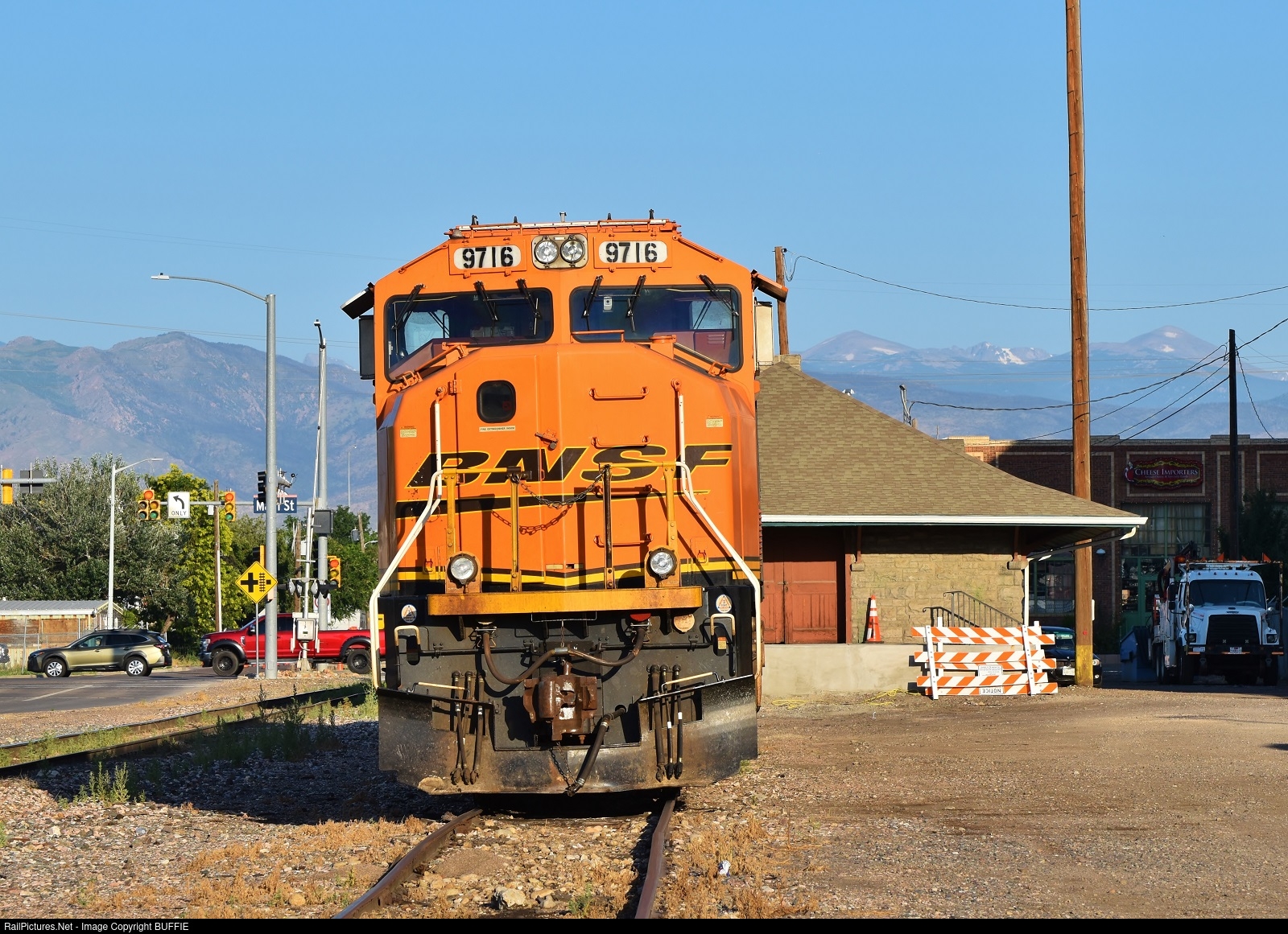 BNSF 9716 (SD70MAC) leans on an uneven house track by the old C&S depot in Longmont, Colorado.