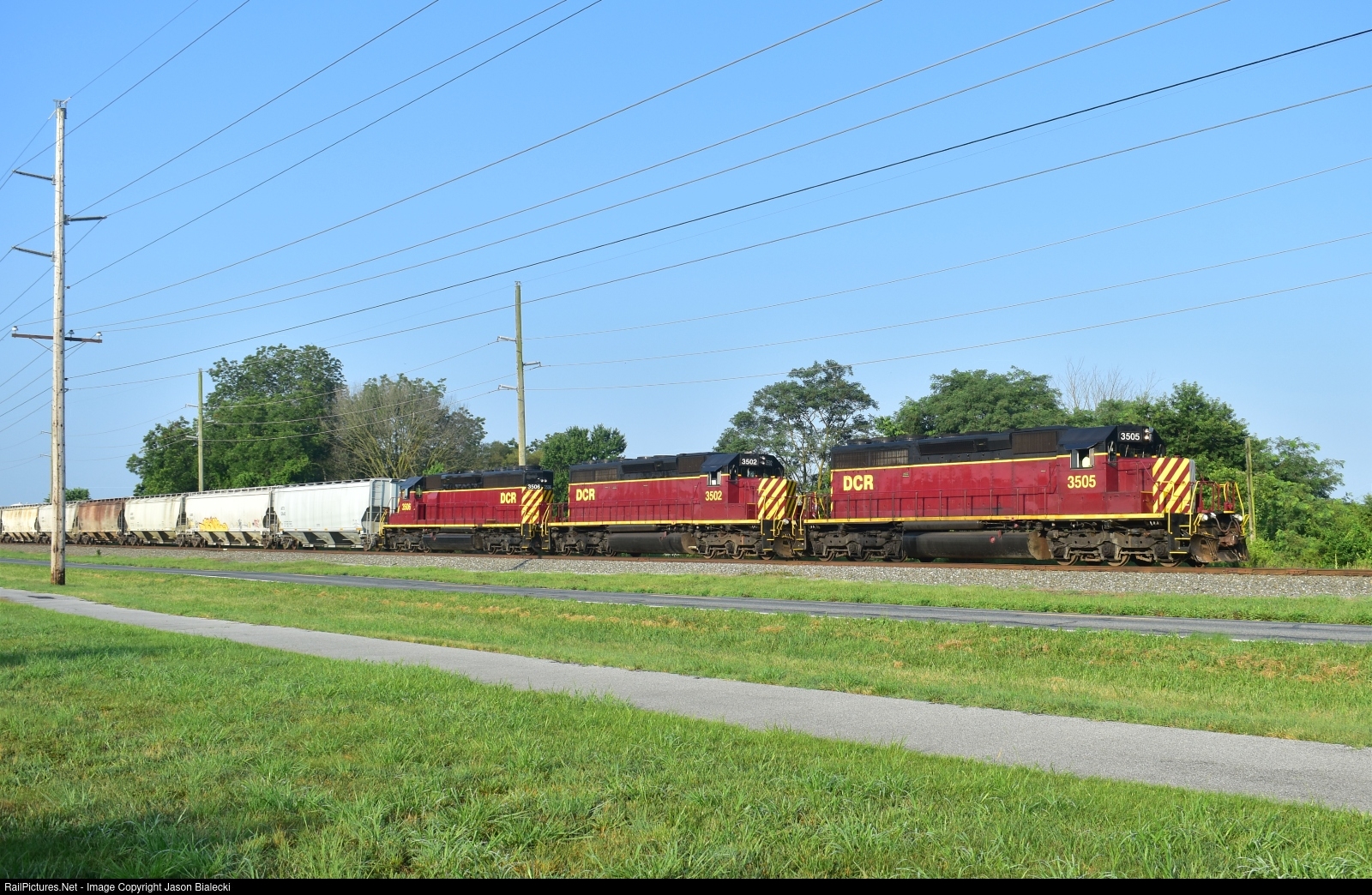 | DCR 3505, 3502 and 3506 are hauling a long train of mostly grain cars north from Seaford to Harrington Yard. The train is moving fast on the Delmarva Secondary alongside Wilson Farm Road, which has a nice walking path. The DCR short-line railroad appears to have improved rail service since taking over operations from Norfolk Southern in 2016. |