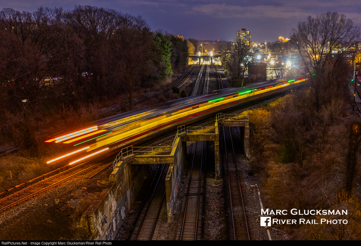 Night Flying Over The Flyover. A train of Kawasaki-built MTA Metro-North Railroad M8s traveling on the New Haven Line crosses the Harlem Line on the Woodlawn Flyover in the Bronx, New York, on the night of April 2, 2025. The small handful of diesel-powered coach trains will all normally have the locomotive facing north, and there are no regular freight operations through here, so the electric MU M8 fleet makes up greater than 99% of the daily traffic over this track, so it can be difficult to come up with a 'creative capture' in this area.