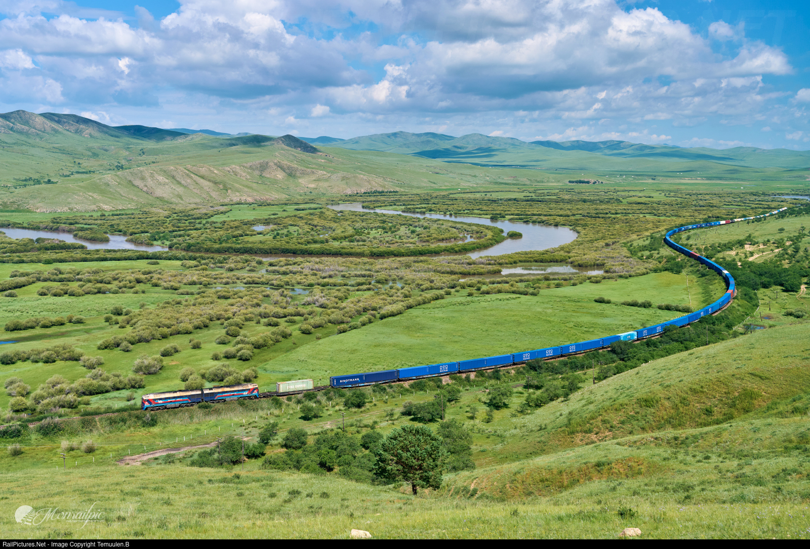 A massive intermodal train hauled by a 2TE116UD locomotive snakes alongside the Orkhon River through the Enkhtal Valley on a typical summer day in the northern section of the Trans-Mongolian Railway. This area is definitely one of the must-visit highlights on our summer and autumn tours.