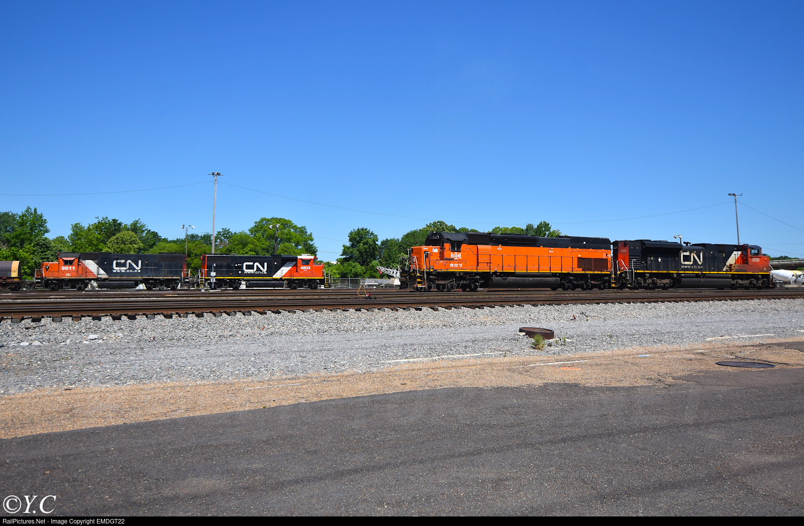 | Having just been set out in CN's Jackson Yard after a trip north from Mobile, former Bessemer and Lake Erie #907 rests as a GP38-2W switches some cars on the far side. |
