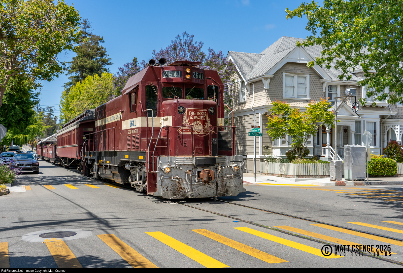 Santa Cruz, Big Trees & Pacific (SCBG) CF-7 locomotive 2641 is seen leading the Beach Train down Chestnut St in Santa Cruz, passing the wig-wag signal on Lincoln St. The former Atchison, Topeka & Santa Fe (ATSF) locomotive is one of 233 former F7 units converted to hood units after the end of passenger service. |