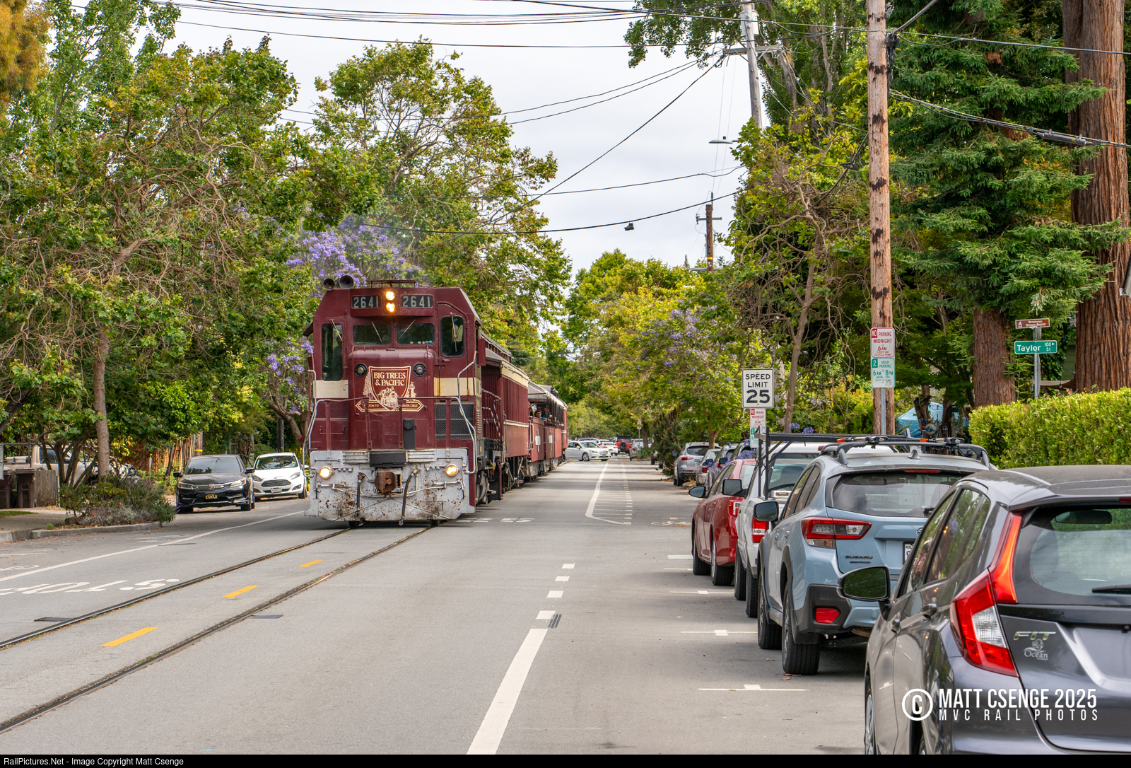 Santa Cruz, Big Trees & Pacific (SCBG) CF-7 no. 2641 is seen crawling up Chestnut St with the Beach Train, heading to Felton. The former Santa Fe locomotive was converted from an F7 after passenger service ended on the railroad. |