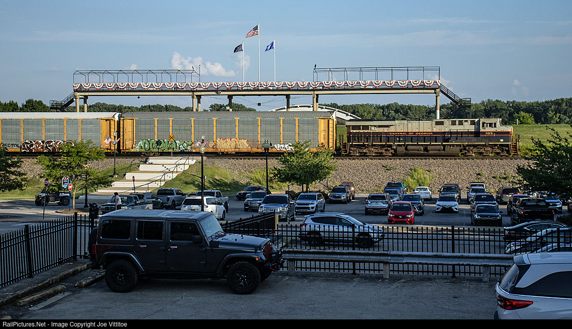 The NS Central of Georgia heritage unit leads 18E west by the New Albany amphitheater.
