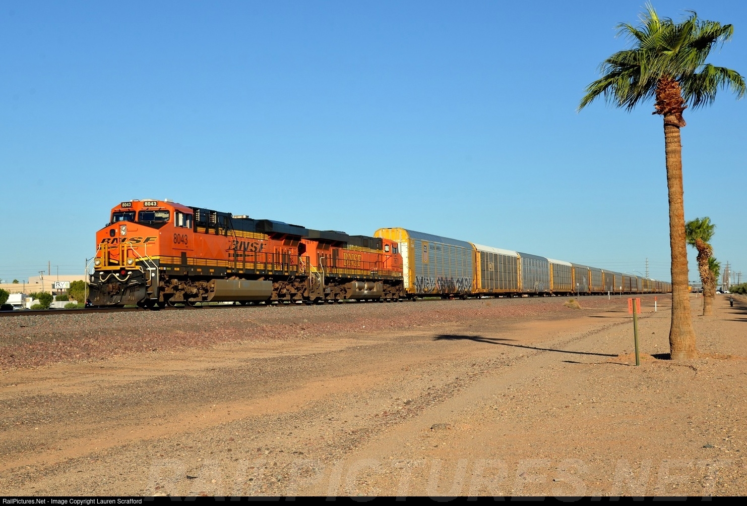 BNSF 8043 W/B at El Mirage, AZ on October 9, 2016 with an Auto train. This was an early morning shot just after 7 am, the second unit is BNSF 7671. This train is just east of the El Mirage yard.