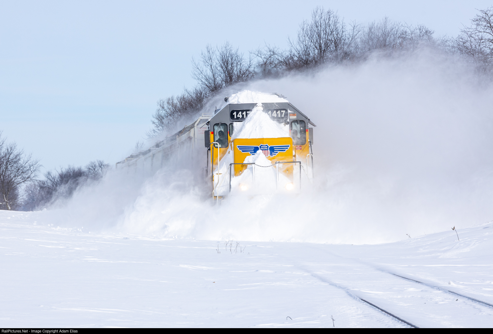 UP 1417 leading the Troy Grove Sub South on the branch after a couple days of heavy snow and drifting.