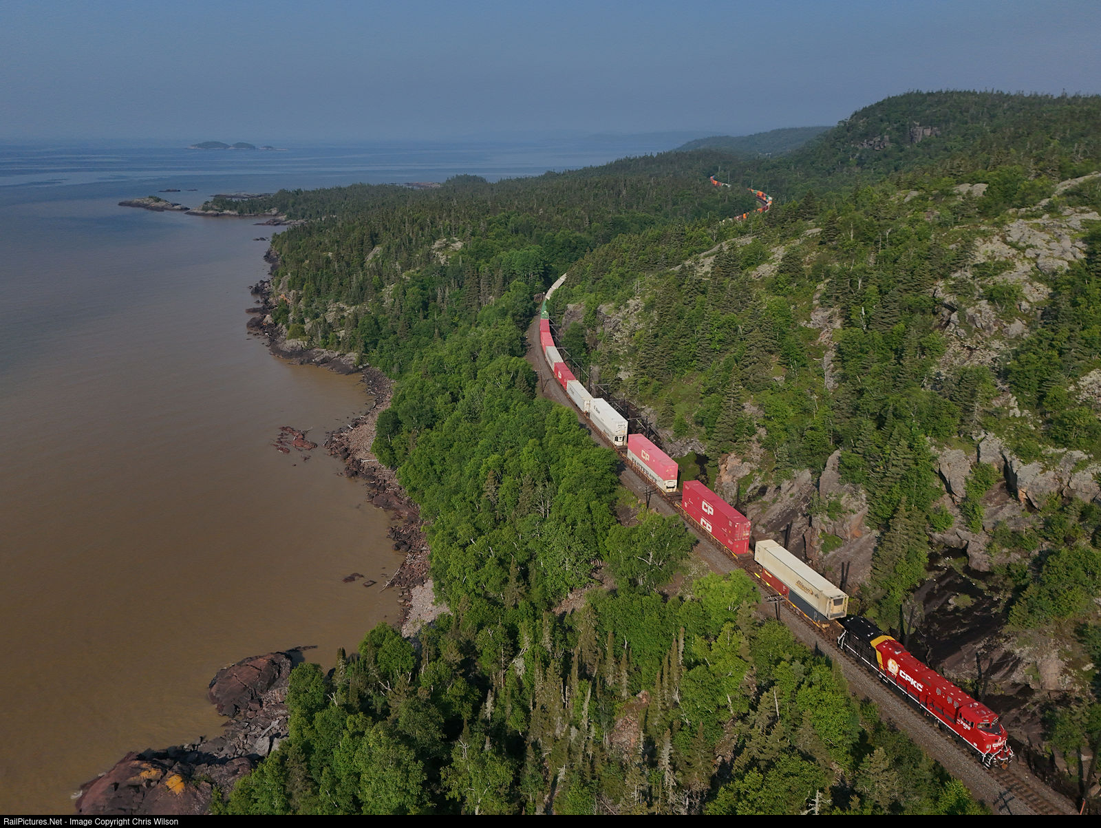Eastbound intermodal train 118 has just departed Middleton with 9000ft of stacks twisting along the north shore of Lake Superior