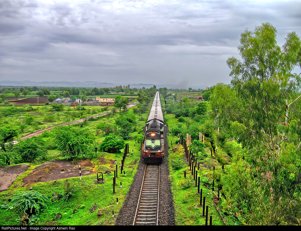 | WDG3a hauled 16210 Ajmer Mysore Express near Lonand in luch green landscape between Nira and Lonand under typical monsoon aura. This section now fully electrified and doubled. |