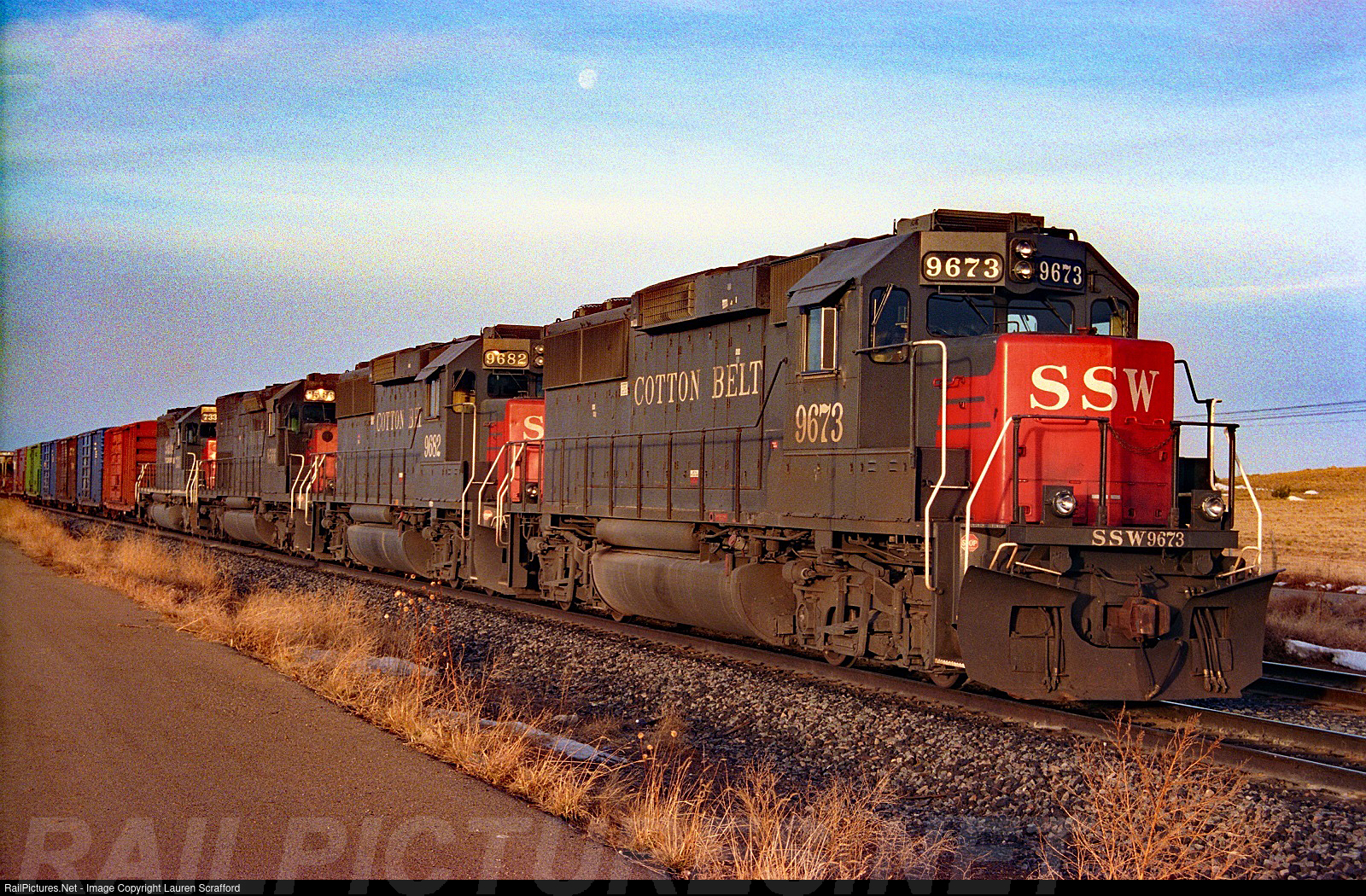 Cotton Belt, SSW 9673 E/B mixed freight waits in the siding at Vaughn, NM on January 13, 1995 for a Southern Pacific W/B Intermodal. The SSW 9673 also had SSW 9682, SP 8566 and 7333 in this consist in the early morning of this day.
